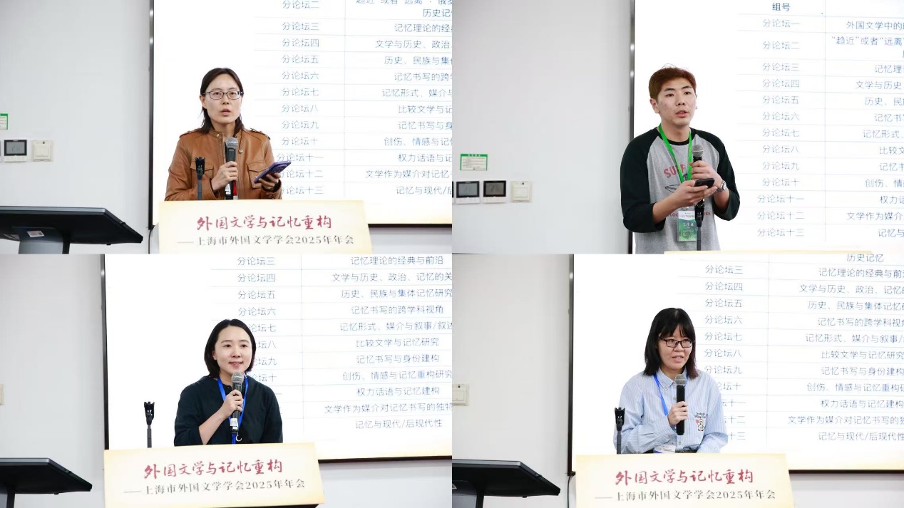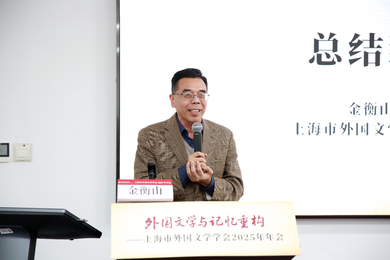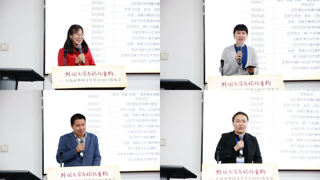 王弋璇秘书长总结了会议的两个关键词:精彩纷呈、温暖热烈。她认为本次会议具有高度开放性和互动性,见证了学术共同体的密切交流,并重点感谢上海市社联和两家出版社对本届年会的大力支持。最后,王弋璇秘书长概括说本次会议将鼓舞上海市外国文学界的学者们以本土性为根基、对话性为桥梁、创造性为引擎,共同书写“外国文学与记忆重构”研究的新篇章。