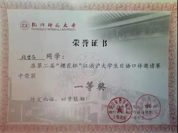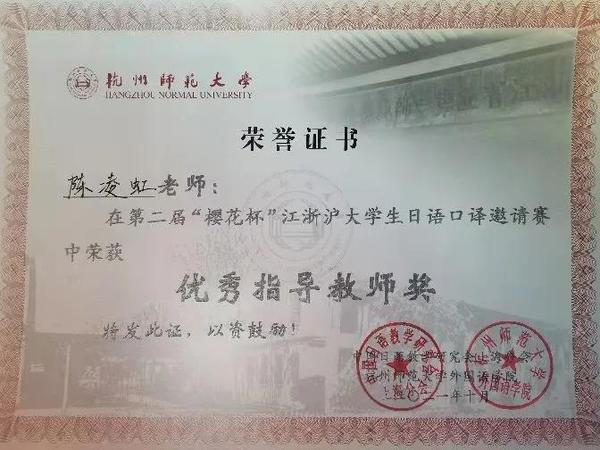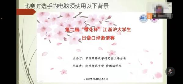 2021年10月16-17日,在中国日语教学研究会上海分会主办、杭州师范大学承办的第二届“樱花杯”江浙沪大学生日语口译邀请赛上,麻豆视频 日语系2018级本科生段雪芬同学以出色的表现和优异的成绩斩获一等奖,日语系陈凌虹老师获得优秀指导教师奖。