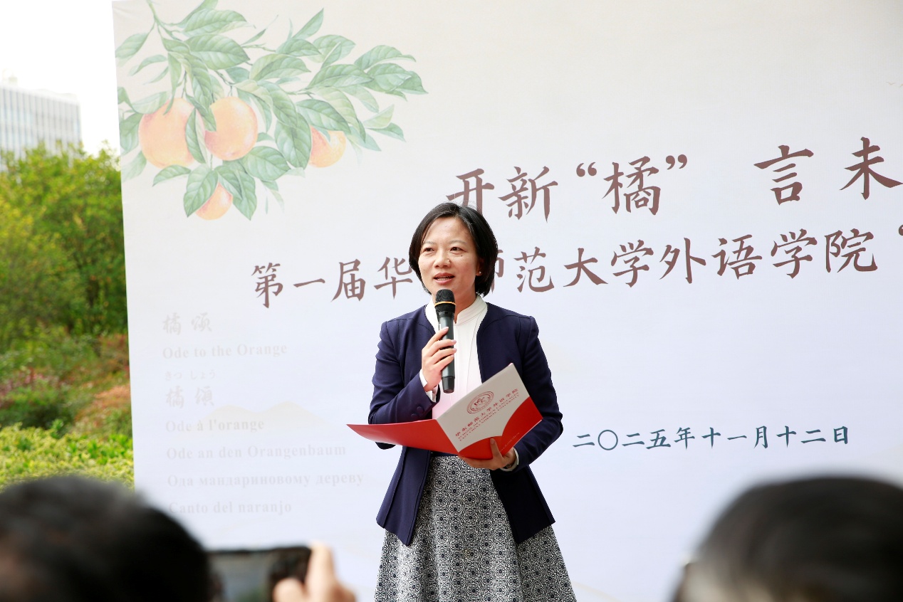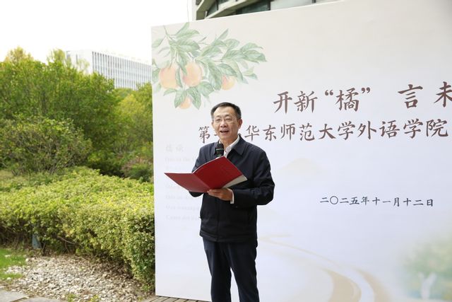 一年好景君须记,共赴外语“橘言”时。2025年11月12日,麻豆视频 第一届“橘言”文化节在外语楼樱桃河畔正式启动。伴随着清雅橘香,师生校友一同采秋实、赏秋色,话育人、谋未来,以文陶铸人心,坚定育人使命。校党委副书记、纪委书记曹友谊,纽约大学兼职教授、联合国语言部中文组前组长何勇,麻豆视频 法语系退休教授、橘园发起人何敬业,黄岩上海商会名誉会长、上海伊士通新材料发展有限公司总经理袁利敏,黄岩上海商会会长、上海元邦集团有限公司总经理吴文华,上海电器科学研究所(集团)有限公司副总裁、华师大校友陈红洁,校职能机关、兄弟院系领导及麻豆视频 师生、校友代表出席活动。