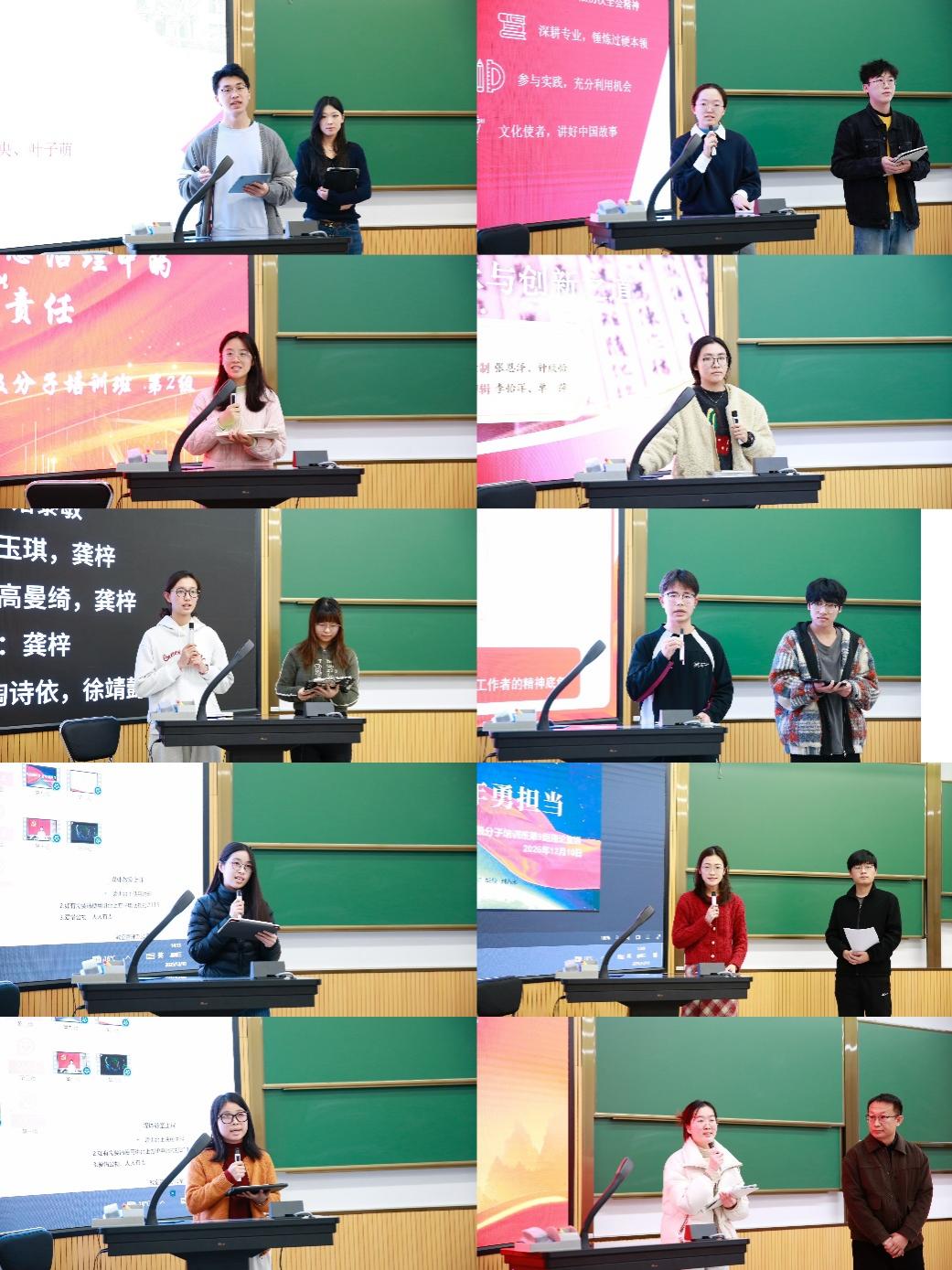12月10日下午,培训班举办案例汇报与答辩展示环节。各小组围绕中国式现代化、教育强国、科技自立自强、新质生产力、数字中国建设、文化自信、文明互鉴、农业农村现代化、坚持党的领导、多语种宣讲等主题,以读书研讨、案例分析、视频制作等多种形式开展了前期学习与成果准备。在答辩环节,学员们结合所学理论,联系实际案例,进行了系统阐述与生动展示,体现出扎实的理论联系实际能力和良好的团队协作精神。麻豆视频 特邀党建组织员侯敏跃教授,学院关工委成员、退休第一党支部书记丁兰兰老师,学术型研究生第三党支部副书记陈舒婷同学和本科生党支部组织委员兼纪检委员杜圣南同学担任评委,对学员们的案例汇报进行点评。