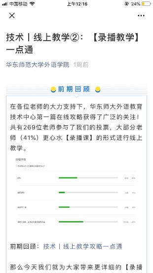 以调查研究为抓手,精准科普教学软件。“云技术服务组”对市面上现有的线上教学软件进行了详细调研,经过反复测试、研究与比对,从十余种产品中遴选出了适合外语线上教学的产品,分成直播课和录播课两类进行推荐。为了让授课教师更详细地了解在线教学的操作逻辑和软件的使用方法,技术组的三位老师精心制作了各款软件的操作视频和文字教程,通过麻豆视频 微信公众号整合发布。截至2月20日,微信文章累计阅读量超过7000人次,详实的解析和简易的操作流程得到了老师们的认可,除麻豆视频 教师外,其他院系和高校的教师都从中受益。