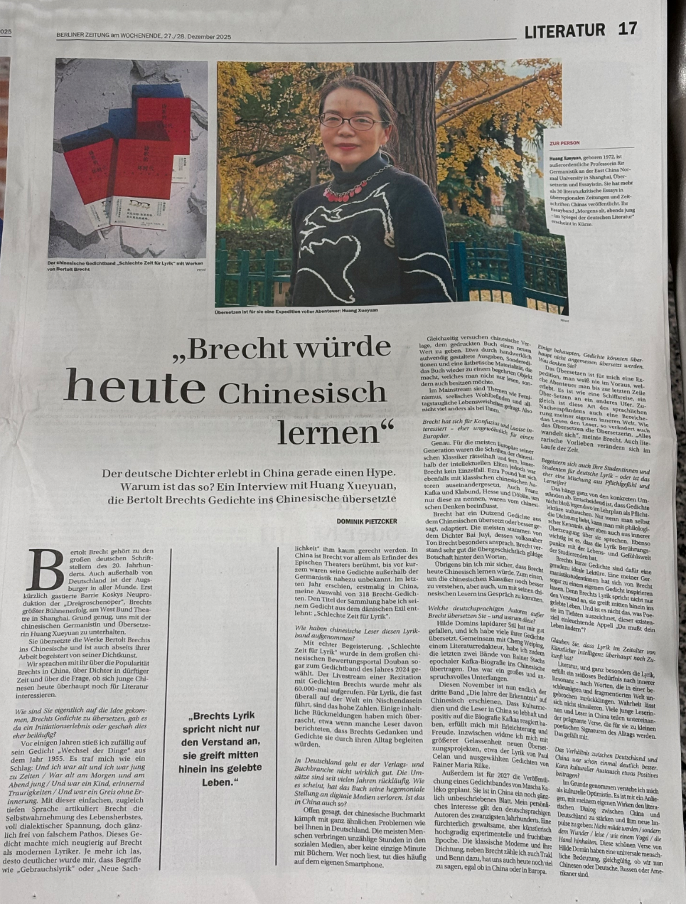 这完全取决于具体情况。关键在于,诗歌不应只是作为必读篇目出现在课程大纲中。只有教师自身热爱诗歌,才能既凭借专业知识,又能发自内心地去谈论诗歌。同样重要的是,诗歌需要与学生的生活世界和情感世界发生链接,产生共鸣。布莱希特的短诗无疑是理想的读本。我的一名德语专业学生受到布莱希特的启发,创作了自己的诗歌。布莱希特的诗歌不仅诉诸理性,更直击现实生活的核心。而诗歌最深刻的特质,不正是那种直抵生存境遇的召唤——“你必须改变你的生活”吗?