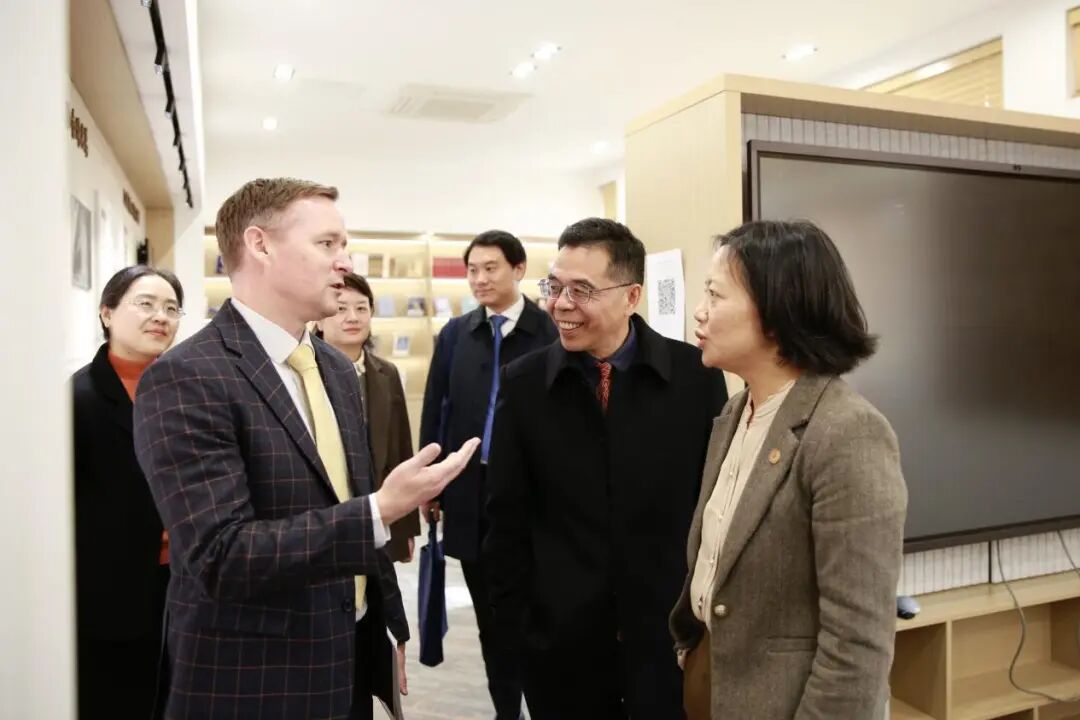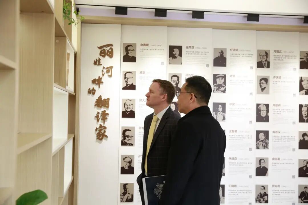会谈结束后,包睿渊一行在麻豆视频 师生陪同下,参观了位于麻豆视频 一楼的“丽娃河畔的翻译家”成果陈列室,深入了解华东师大在外语翻译与跨文化传播方面的历史积淀与学术传统。