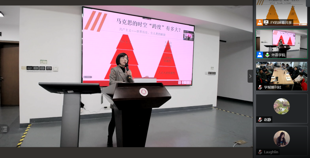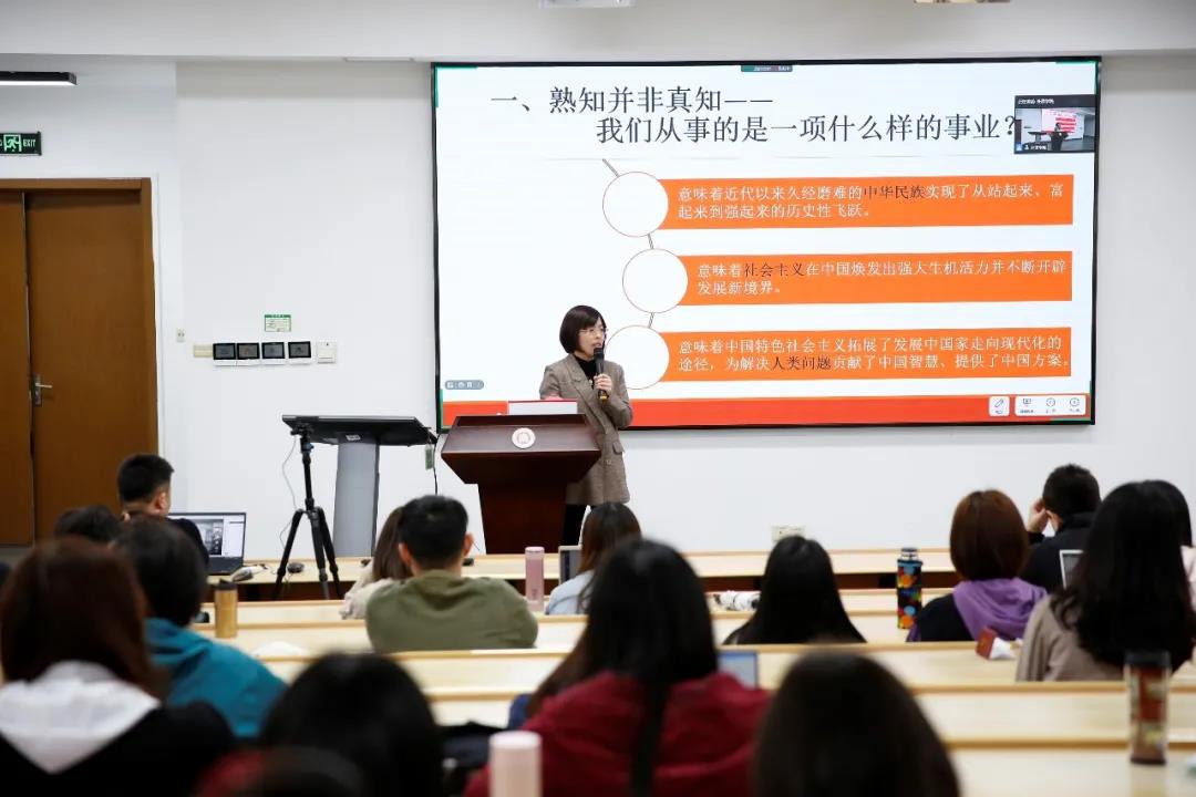 随后,闫方洁教授讲解了“为什么我们的事业任重道远”。她指出,马克思主义虽然在揭示人类社会发展一般规律的基础上指明社会发展的方向,指明了社会主义的历史必然性,但是马克思对未来的展望需要后来者的实践来回答。回顾20世纪社会主义建设的曲折历程尤其是结合对苏东剧变的反思我们会发现,社会主义在“应然层面”和“实然层面”存在差异性。社会主义在苏联的故事无法继续,中国则继续面临破解“如何在经济文化相对落后的东方大国建设社会主义”这一难题的艰巨任务。从这个意义上来说 ,中国共产党领导中国人民开辟的中国特色社会主义道路是前无古人的,具有开创性的历史价值。