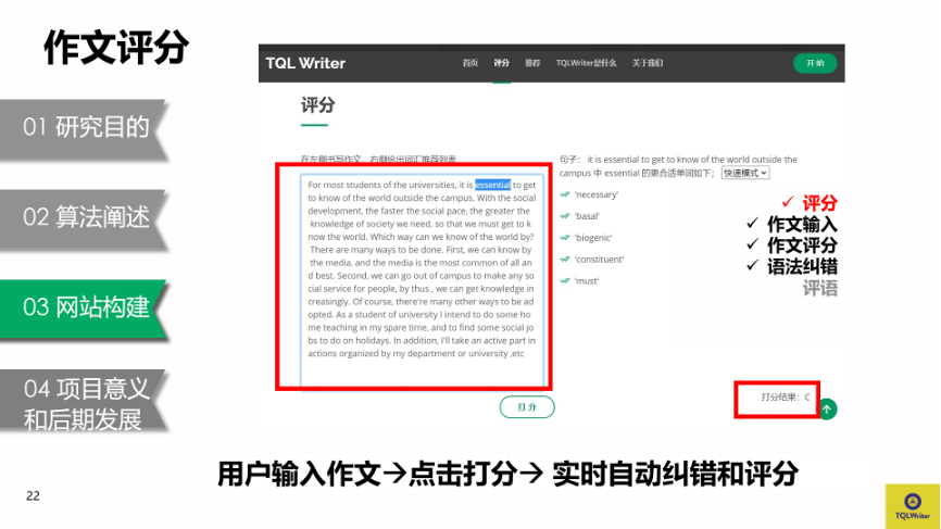在平台建设过程中,项目团队成员剖析了中国外语学习者的英语写作特点,分析了目前市面上已存在的写作辅助系统的缺陷。同时,团队成员以较为成熟的二语习得理论作为理论基础,引入自然语言处理、机器学习、人工智能等技术,着重解决当前大学生英语写作过程中文本连贯性不足、搭配不当等问题。