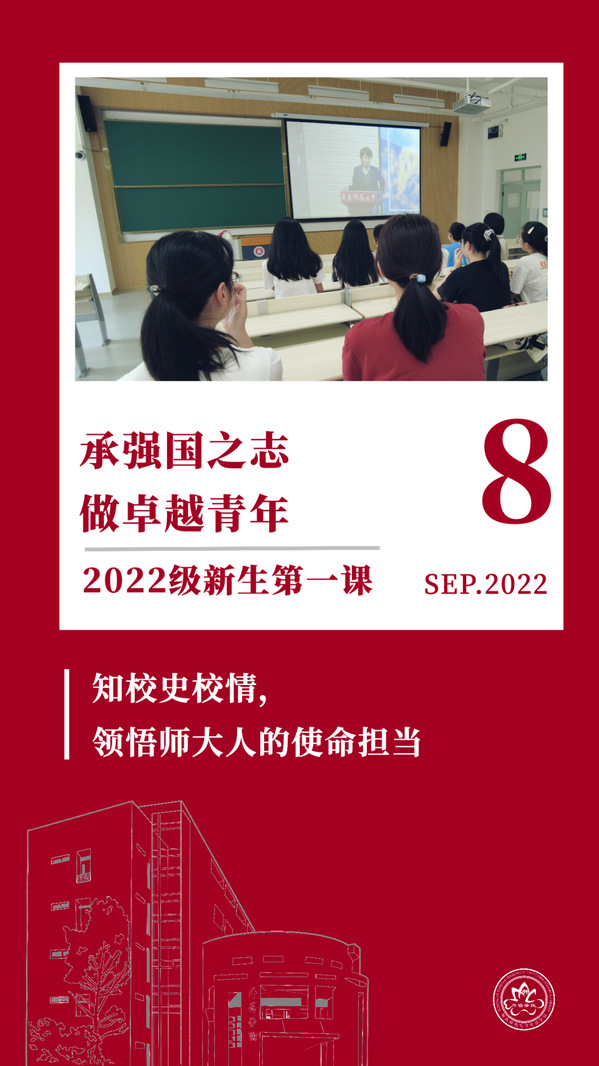 9月8日下午,校党委书记梅兵以“承强国之志,做卓越青年”为题作校史校情报告,面向2022级新生讲授开学第一课。从“光大华夏”的初心,到丽娃河畔的文脉,新生聆听讲述师大故事,溯源师大文化,领悟师大人的使命担当。