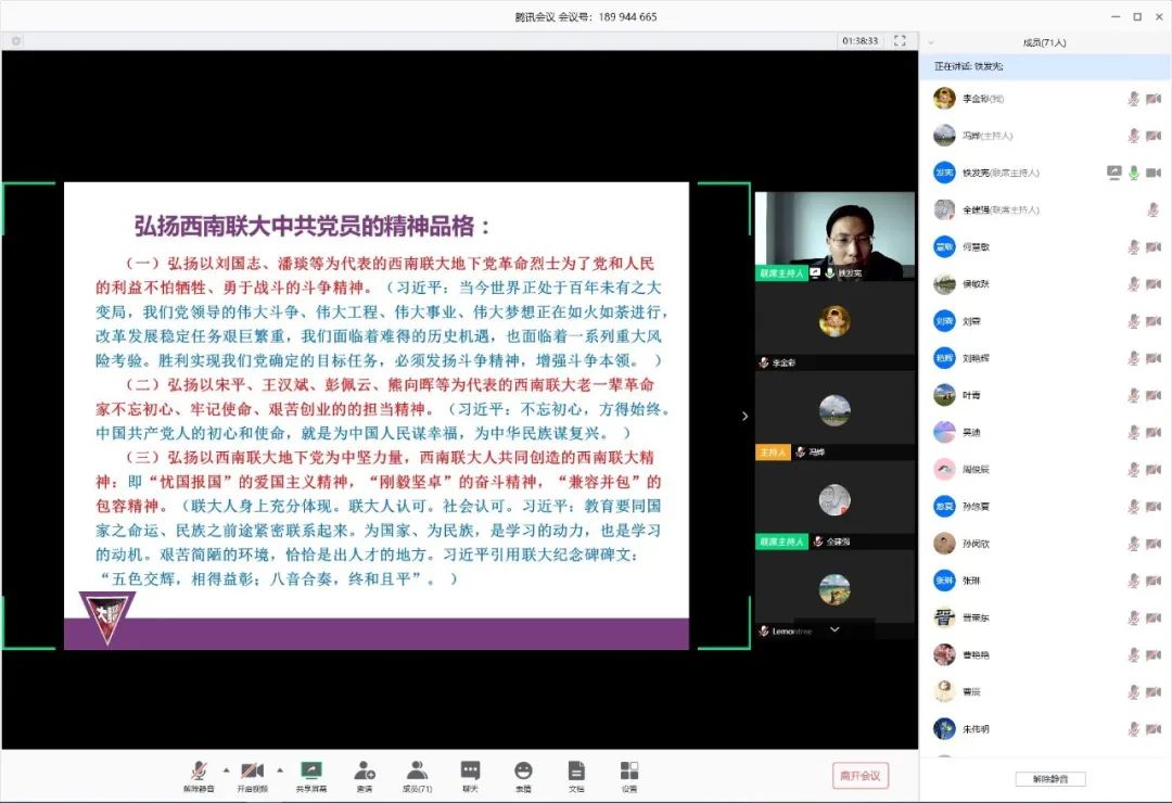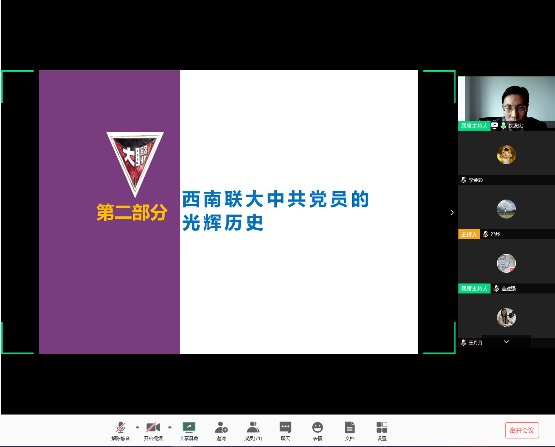 这次主题党日活动中,安排了学院党委 “百年征程·初心不忘——党史系列学习”的第一讲,特邀了云南师范大学西南联大干部教育学院副院长、云南西南联大研究会会员、云南师范大学西南联大文创中心特聘专家铁发宪老师,以“西南联大时期的共产党员”为题,在线上带领大家重温了西南联大的辉煌历史,对西南联大时期的共产党员的英勇事迹和崇高的革命奋斗精神进行了系统深入的学习。