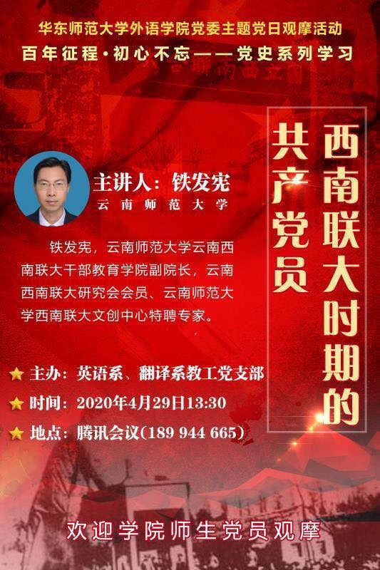 最后,学院党委书记闫露做总结。她指出,新冠疫情带来了特殊的困难与挑战,在这样复杂艰难的时刻,英语系翻译系联合教工党支部精心策划组织了关于西南联大党员之光辉历史的主题党日活动,通过网络连线邀请铁发宪老师从彩云之南“飞”到浦江之滨,与麻豆视频 师生党员共聚一堂,充分响应了疫情之下“转危为机”的号召,是麻豆视频 党史系列活动的良好开端。希望学院党员教师通过对党史的系统深入学习,不断地丰富自己的学识,从历史中汲取前进的力量和涵养初心的养分,并把所思、所想、所学、所见带入课堂,在新时代的教育战线上做好教书育人的工作,践行共产党员的使命与担当,为社会和国家培养优秀的外语人才。(撰稿:李金彩)