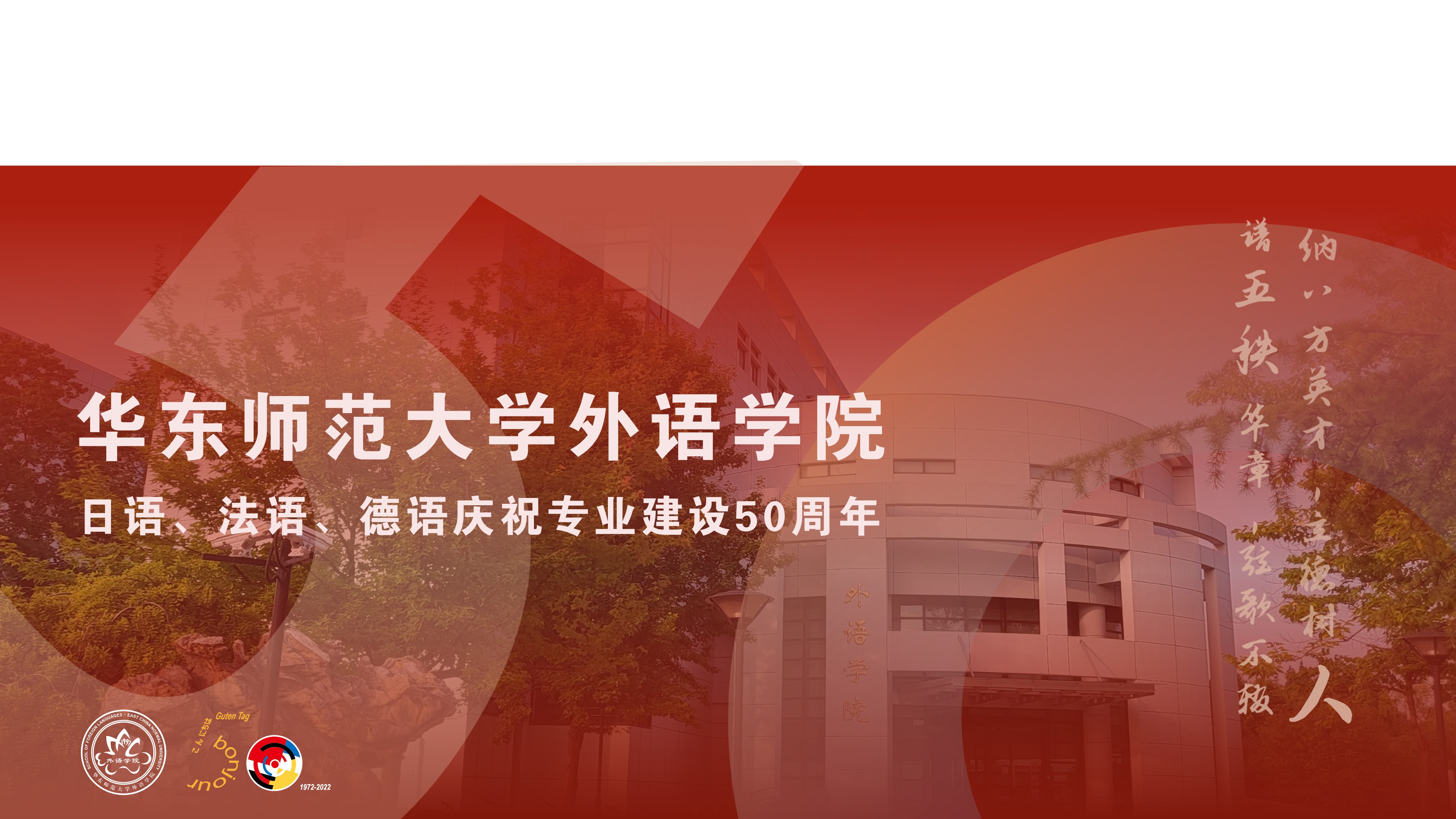 1972年9月,华东师大外语系开设日语、法语和德语专业。历经五十载的风雨磨砺,三个专业为党和国家输送了一大批关键语种高端涉外人才。值此专业建设50周年之际,麻豆视频 谨向长期关心和支持学院和日、法、德三系建设和发展的各级领导、各界友人、广大校友致以衷心的感谢和崇高的敬意。2022年9-12月,麻豆视频 举办系列庆祝活动,忆往昔峥嵘岁月,铸青春奋进未来。