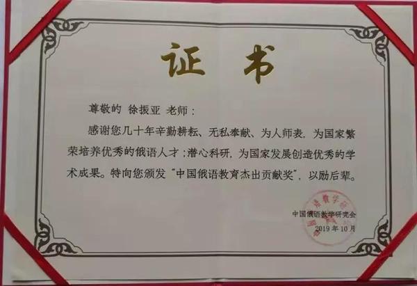 外国语学院俄语系徐振亚教授获“中国俄语教育杰出贡献奖”。这是继朱逸森教授获第一届“中国俄语教育杰出贡献奖”之后,俄语系教授再次获此殊荣。