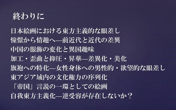 刘建辉教授利用其十多年来搜集整理的丰富的图片资料,介绍了近代以前日本画家发挥想象画出的千篇一律的“唐美人”,以及随着近代交通业和旅游业的发展,一批日本画家得以访问旅居中国,与中国作家保持良好的交流,并在此基础上创作的“旗袍美人”、“汉服美人”等画作,指出日本画家对中国文明、文化的憧憬与关心,进入近代后,随着国家形势和中日文化权利结构的变化,其表象也从“憧憬”转变为“情趣”,且不断被继承并延续到战后,形成了一种固定的文化符号。