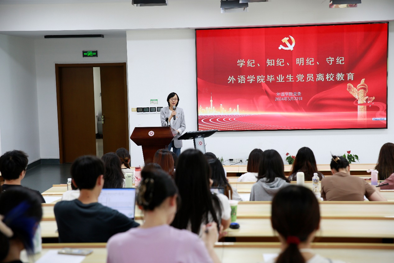 党委结合党纪学习教育安排,在外语楼333报告厅,开展以“学纪、知纪、明纪、守纪”为主题的毕业生党员离校教育,全体毕业生党员参加。学院党委副书记兼副院长江宇靖主持会议。