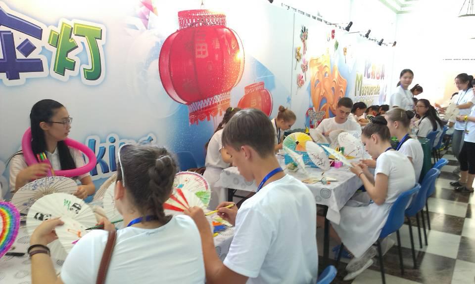 7月29日志愿者们在中福会少年宫带领各国的孩子们体验了“中国书法”、“拓印”、“纸艺”、“蝶艺”、“京剧脸谱制作”、“中国功夫”等中国特色民间艺术项目,在志愿者的细心指导下,小朋友们制作出了可爱多彩的粽子香囊、独具特色的扇面脸谱和精巧优美的趣味伞灯。