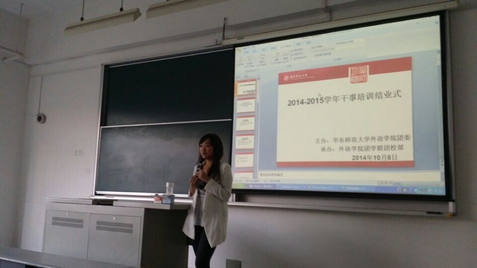 团学联干事培训班于2014年10月19日下午3点正式举行。首先,素拓部部长钟语嫣为团学联干事们进行了名为“如何做一名团学联的人”的干事培训。钟雨嫣用生动亲切的语言向同学们描述了加入团学联的感受,通过自己的亲身经历针对团学联工作过程中的成功与挫折,向同学们传递出一种积极向上,认真负责的团学联精神,令同学们在会心一笑的同时又受益匪浅。
