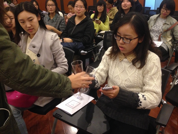 庄老师便请同学们品尝了各类法式甜点。热身之后,今天的嘉宾老师登场了,在欣赏完一段关于葡萄酒的电影片段之后,老师便将话筒交予同学们,期待知道同学们想了解哪些关于红酒的知识。同学们踊跃地表达了自己的观点:渴望了解识酒,辨酒,配菜等各方面的知识。而后便是活动的重点:葡萄酒酒品鉴,第一款酒是来自波尔多的白葡萄酒。在同学们品酒的同时,老师从闻酒,醒酒等方面介绍了如何品尝葡萄酒。第二,三款酒分别是陈年的红葡萄酒和勃艮第的新红葡萄酒。老师在介绍带来的酒的同时也讲解了法国的几大葡萄酒产区以及各产区的葡萄酒的特点。