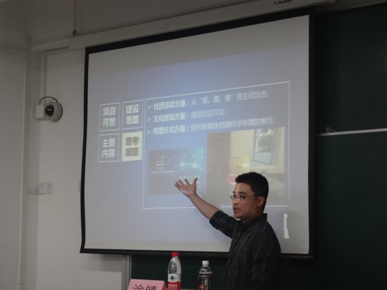 涂皘老师是生命科学学院“科学明航会”的负责人,同时也担任着多个社团的指导老师。在讲座上,涂老师主要介绍了“科学明航会”以及“爱·生·科”社团联盟的建设背景、运营思路以及取得的喜人成果。在介绍的过程中,涂老师也给予了同学们对于运营社团的建议,比如要大力寻求政策支持、充分调动人脉资源、联系社团与专业优势、建设社团品牌文化等。并且社团在从社会获得资源的同时也要反哺社会,履行服务社会,人才培养,科学研究,文化传承的职责。