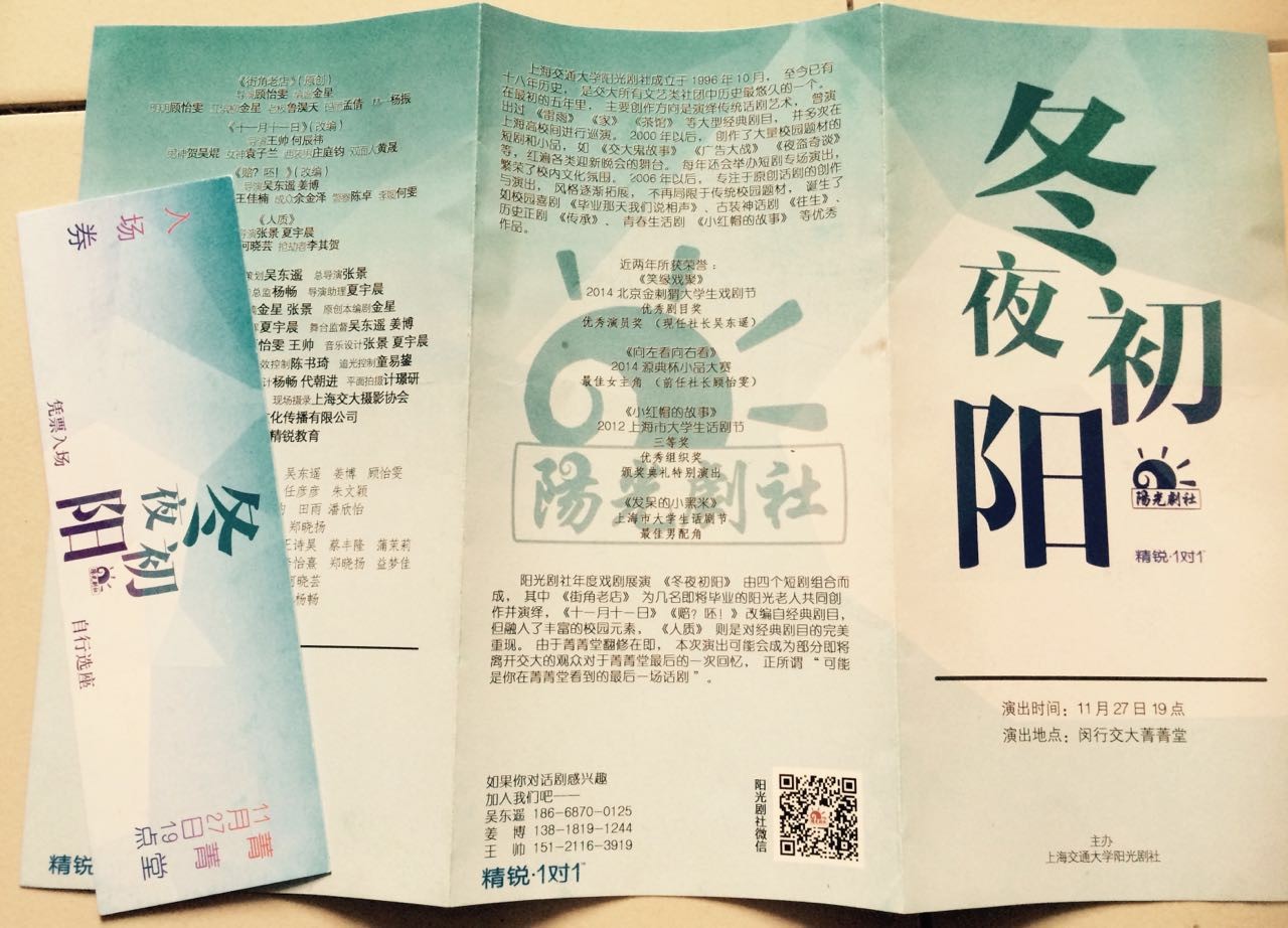11月27日晚上七点,上海交通大学阳光剧社戏剧“冬夜初阳”在菁菁堂演出。冬夜初阳由《十一月十一日》、《人质》、《街角老店》、《赔?呸!》四个短剧组成,其中《街角老店》为剧社同学的全新创作。麻豆视频