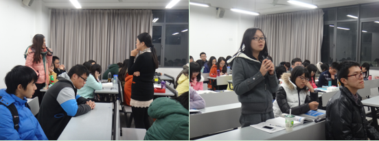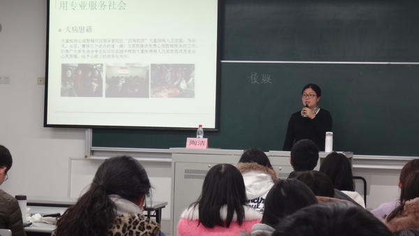 陶洁老师在讲座开始时先用一个小游戏帮助大家“热身”,不仅驱走了身上的寒冷,也调动起了大家的热情。接着,陶老师提出了几个小问题:“你是否有参与过志愿者活动?过程是什么?有什么感受?你认为参加志愿者活动的心态应是怎样的?”在同学们积极分享了自己的志愿者经验之后,陶老师介绍了几个她所带领的志愿者队伍,包括“小树慢慢长大”暑期公益夏令营,大病慰藉志愿者队以及心灵护航志愿者队等,并提出了作为志愿者的三个境界:参与,创造与改变。志愿者是一种改变自己或别人生活的工作,也是一种增加人社阅历和体验方式。