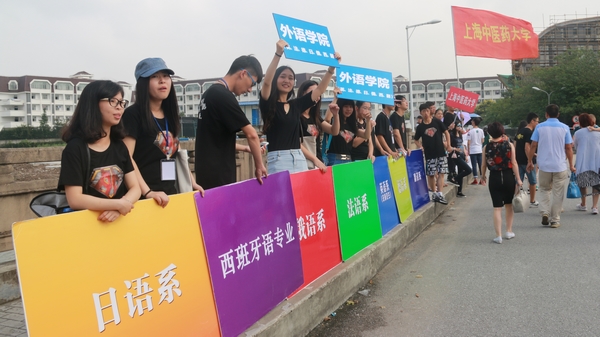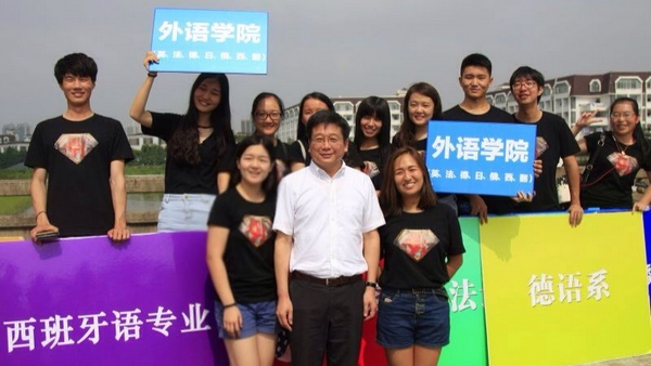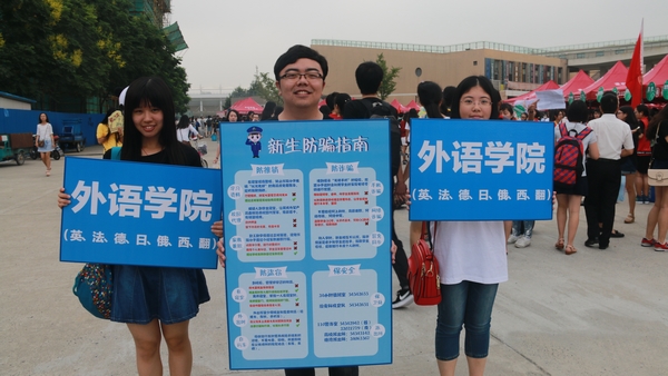 高举八色欢迎板,分别是日语系、西班牙语专业、俄语系、法语系、英语系(非师范生)、德语系、翻译系及研究生,当新生们踏上报到的必经之路,便能找到麻豆视频