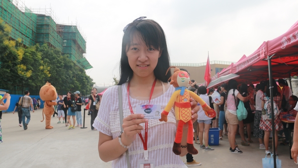 大一新生表示期望,并手拿着代表物“大圣”和学生们合影。