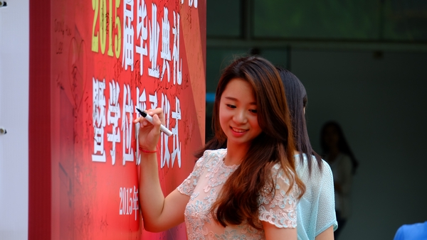 2015届毕业生搭建了一个大舞台。毕业生们纷纷拿起签字笔,在舞台的红色背板上签下自己的名字,同时合影留念,记录这珍贵的时刻,以及毕业的激动与喜悦。