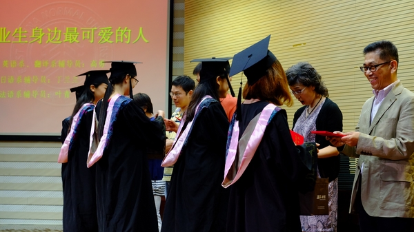 “最受学生欢迎教师与毕业生身边最可爱的人”的名单,分别是:英语系的徐卫列老师,日语系的宇野雄二老师,法语系的胡慧俐老师,德语系的黄惠芳老师俄语系的贝文力老师,以及翻译系的陈舒老师。各系的毕业生代表为自己心目中最优秀的老师颁奖,在台上合影,而台下,也是掌声雷鸣。