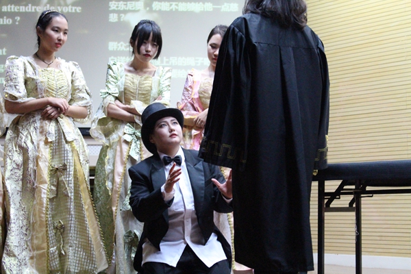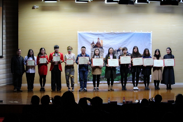 最后,庄瑜老师为“穿越时空”剧本改编大赛的获奖同学颁发证书。德语系沈雨婷获得一等奖。在大家的热烈掌声中,外院第六届舞台剧大赛圆满落幕。(撰稿:曹宏丽;摄影:胡佳洁、任楚、戴心怡)