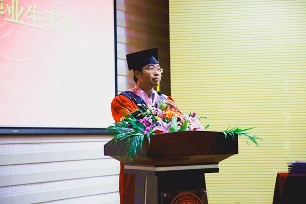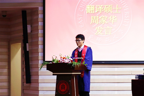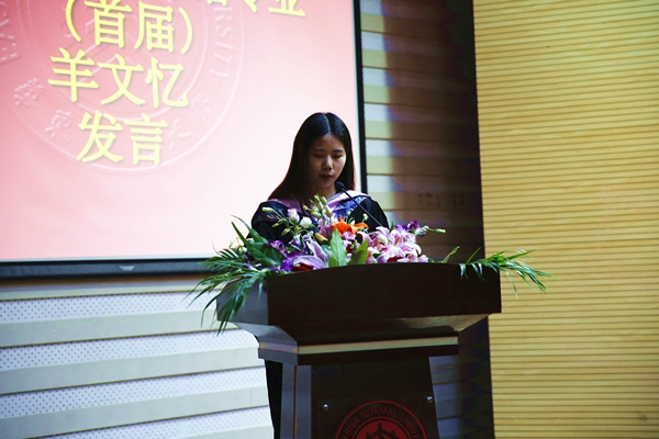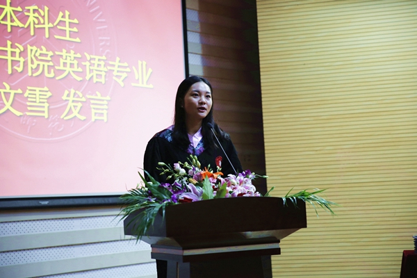 本科师范生代表英语系葛文雪,本科非师范生代表西班牙语专业羊文忆和硕士生代表翻译硕士周家华作为毕业生代表先后致辞,他们表达了对于母校几年来培养的感谢和对于即将离开的感伤,但他们都已做好准备迎接下一个人生阶段的挑战。