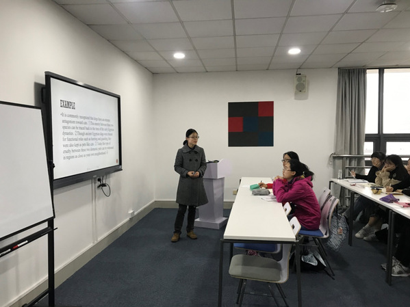 大学英语部邀请,复旦大学外文学院写作中心郭骅老师来到大学英语部第二课堂“英语·家”503教室,为我校英文写作坊的同学们带来了一场题为“学术写作的三大要素”的精彩讲座。英文写作坊的负责老师和写作坊全体学员参加了此次讲座。
