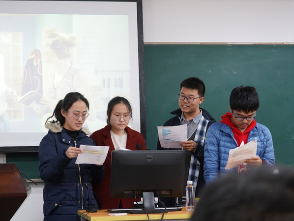 比赛到此已全部结束,但精彩仍在继续。在评委们评分和讨论的时间里,三年级的四位同学,也是去年晋级“第七届全国高校西语配音大赛”11强的队伍,为师生们带来了电影《神偷奶爸2》片段的配音表演。学长们从容自如的吐字、游刃有余的衔接配合和惟妙惟肖的模仿抓住了在场每个人的注意力,大饱耳福的观众们为他们送上了全场最热烈的掌声。