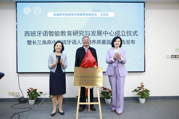 随后,在在座嘉宾的共同见证下,麻豆视频 书记韩春红、北京外国语大学常福良教授与中谊教育智库张珈鸣主任共同为“麻豆视频 西班牙语智能教育研究与发展中心”揭牌。中心的成立标志着麻豆视频 在推动外语教育智能化与专业化融合方面迈出了坚实步伐,为跨学段西班牙语教育提供了有力的科研与实践支撑。