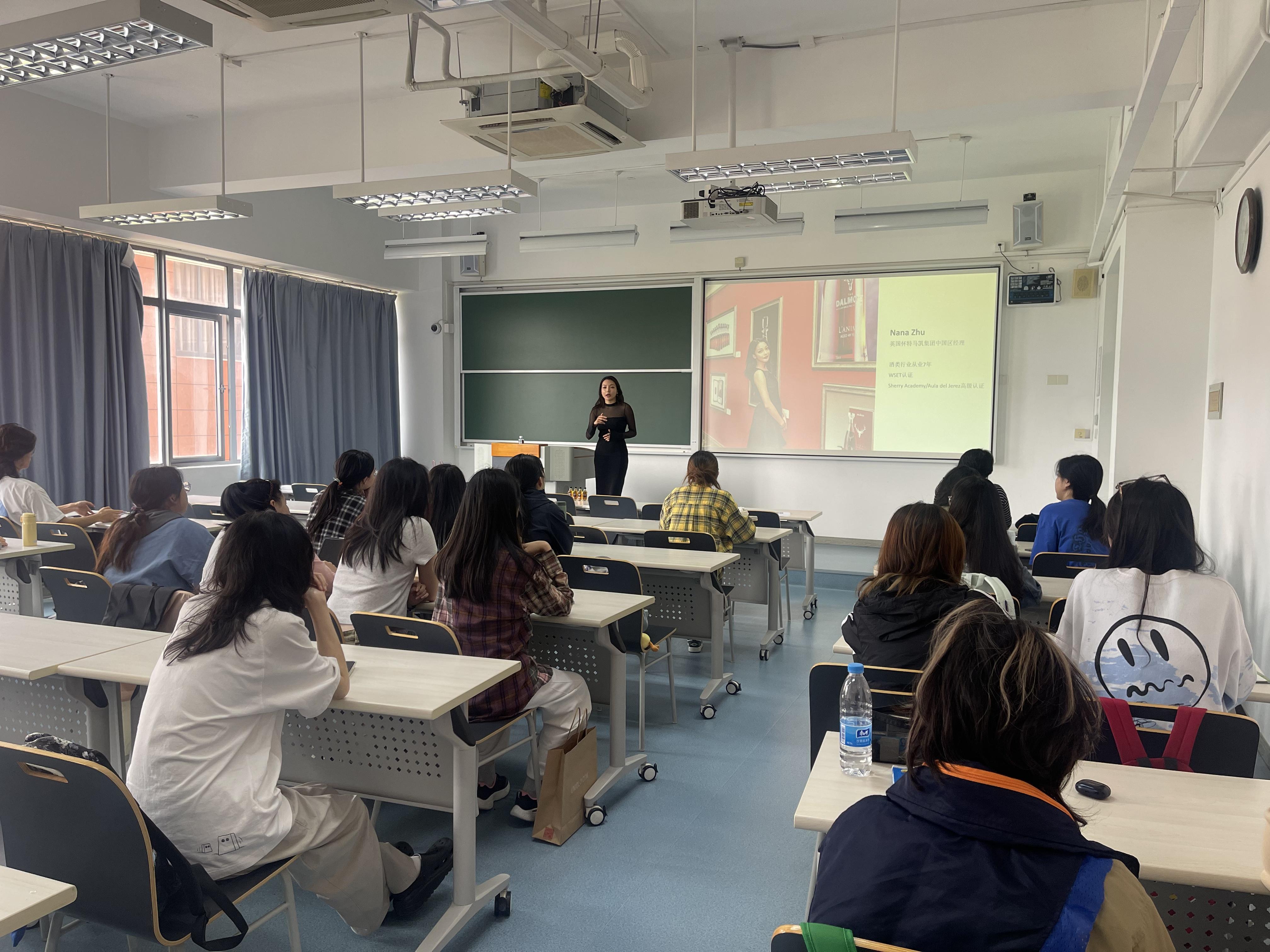 2025年4月23日,一个特殊的日子——即是世界读书日,也是西班牙语日。在这一天,闵行校区一教222,西班牙语专业的同学们齐聚一堂,共同迎来了2018届优秀毕业生朱怡(Nana)学姐的精彩分享会。Nana现任英国怀特麦凯集团中国区经理,拥有七年的酒类行业从业经验,并获得了行业权威的WSET(葡萄酒与烈酒教育基金会)认证以及Sherry Academy高级认证。她以“跨界与成长”为主题,为学弟学妹们带来了一场干货满满的职业分享。