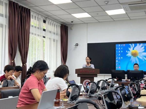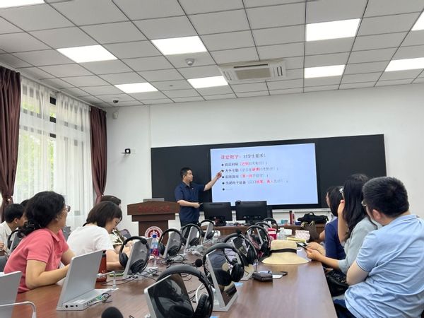 严文庆主任首先发表了主题演讲,详细阐释了AI技术在大学英语教学中的潜在应用及其推动教学改革的巨大潜力。他强调,随着科技的飞速发展,AI技术已经展现出极大的潜能,特别是在通过智能语音和图像识别技术来辅助阅读、写作、翻译等教学活动方面。在深入讨论的环节中,与会教师围绕AI技术赋能下的教学方法及课堂教学的创新进行了广泛的交流。教师们分享了各自在整合AI技术与英语教学过程中的经验和挑战,并共同探讨了如何更有效地利用AI技术提高教学效果和学生的学习体验。
