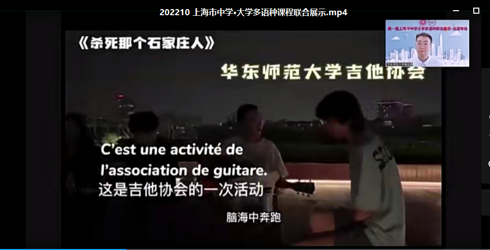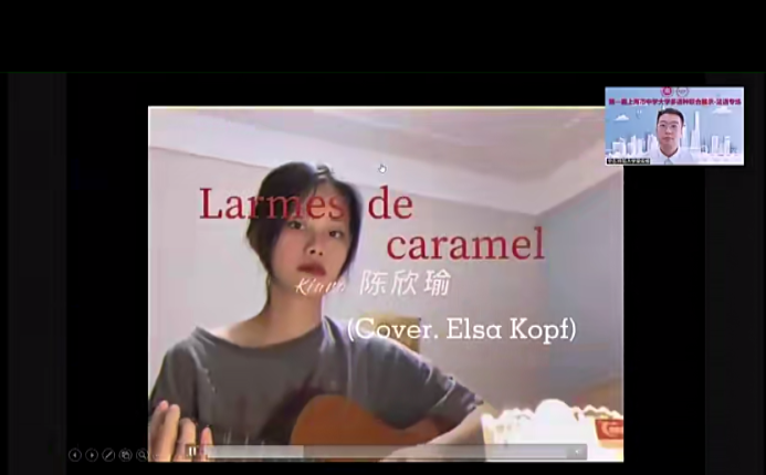 欣赏完大学生的校园生活片段,第二个主题是观看中学生们制作的视频作品。这些作品从全市92件参赛作品中脱颖而出,从多维的角度出发,用法语讲上海故事,介绍了上海的百年发展历程,探讨了上海市15分钟城市生活圈的建设,介绍自己居住环境的变迁,并展示了学生自身的才艺,如自弹自唱法语歌曲、法语配音、自编自导的小短片等,十八般武艺令人目不暇接。