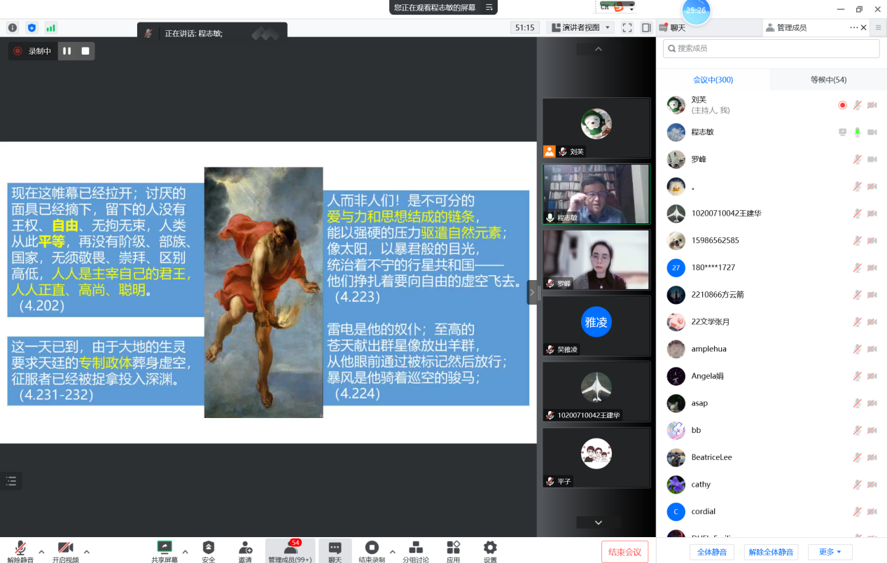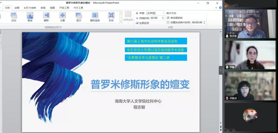 邀请,海南大学社科中心教授、中国古典学学会常务理事程志敏老师,为我院师生做了主题为“普罗米修斯形象的嬗变”的讲座。本次讲座入选第21届上海市社会科学普及活动周,系百场校级学术讲座第52讲。讲座由英语系罗峰副教授主持,逾300名校内外师生以腾讯会议的方式线上参与。