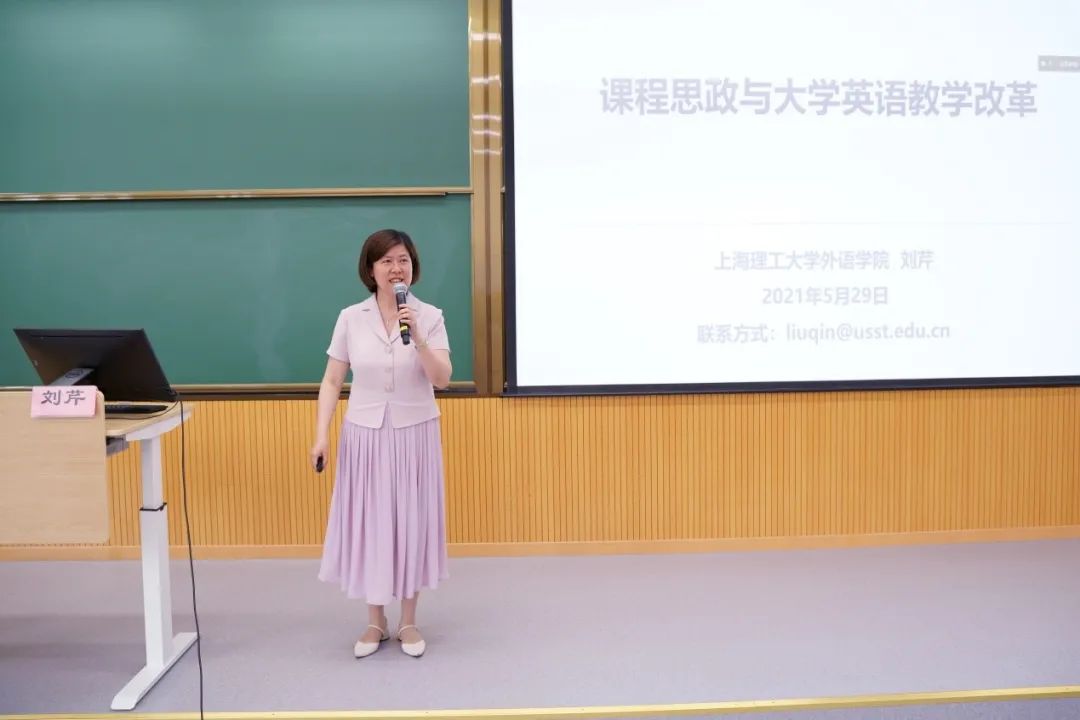 随后,刘老师对上海理工大学人才培养总体目标、课程思政与大学英语教学改革历程做了详细介绍。她结合丰富的个人教学案例,从背景知识融合、语言点融合两个方面介绍了如何把课程思政润物无声地融入外语课堂。