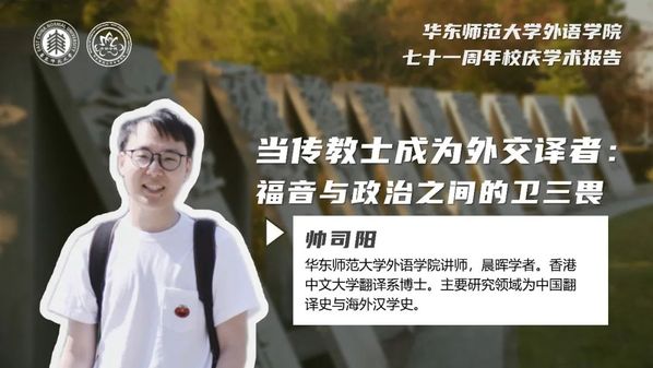 翻译系举办线上校庆学术报告会。翻译系教师贾兰兰和帅司阳受邀分别以“口译中的跨文化交际”和“当传教士成为外交译者:福音与政治之间的卫三畏”为题,为参会师生作出了精彩的报告。