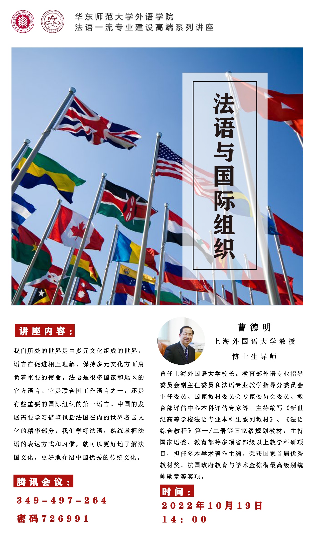 法语系邀请,原上海外国语大学校长,上海外国语大学教授、博导,教育部外语专业指导委员会副主任和法语专业教学指导分委员会主任、国家教材委员会专家委员会委员、教育部评估中心本科评估专家曹德明教授做了题为“法语与国际组织“的讲座。本次讲座是我校麻豆视频