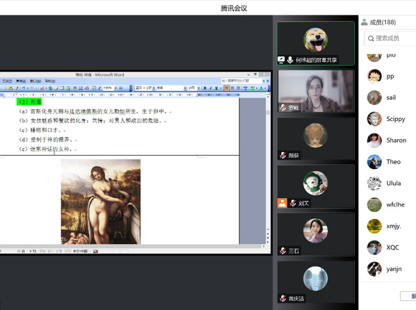 师生做了主题为“智术与悲剧:从高尔吉亚的《海伦颂》到欧里庇得斯的《海伦》”的讲座。本次讲座系“古希腊文学与思想史”系列讲座第5讲,由英语系罗峰副教授主持,200余名校内外师生以腾讯会议和B站的方式线上参与。