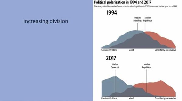 首先,Joe教授佐以简洁明了的图表回顾了从1994年到2017年日益加剧的美国政治的两极化,以及近十年来民众对于联邦政府的较低的信任率。