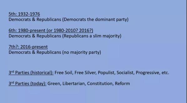 接着,Joe教授梳理了自1790年以来的美国政党变迁史,并列举历史上的第三政党与如今的第三政党。两百多年来政党政治流动性非常大,大致上经历了六次版图大洗牌。Joe教授判断第七代政党体系可能从2016年特朗普上台以来就初具雏形,而这一观点要等到多年后人们回顾历史时才能得以证实。