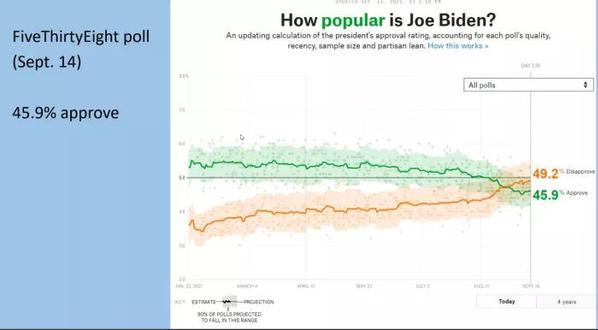 讲座伊始,Joe Renouard教授佐以清晰的图表数据,说明拜登与美国民众的“蜜月期”已经结束,拜登的民调支持率不断下滑。结合各项民调数据,Joe Renouard教授将拜登支持率下降归结于三个主要原因:经济,疫情和边境问题。