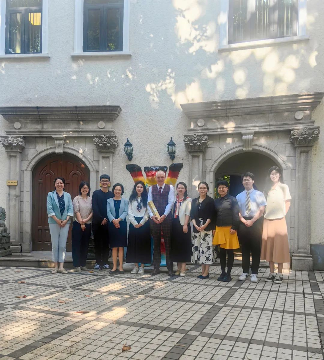 党委书记韩春红,院长助理、中欧文明互鉴研究中心主任王婀娜教授、校国际合作与交流处代表张超、德语系副教授黄雪媛、晨晖学者魏子扬博士,以及德语系本科生代表李子涵、胡若宇和龚若妍一行八人拜访了德国驻上海总领事馆,与德国驻上海总领事馆文化科教领事孔有为先生(Uwe Koch)进行了亲切友好的交流。