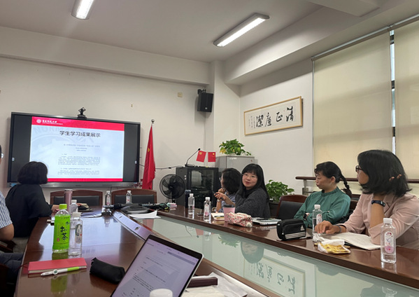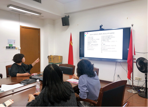 首先,尹松老师介绍了课程思政的建设目的、《东亚文化视野下的日本语言文学》的开课数据,包括开课学期、修读人数、评价数据等。接着,尹老师、吴老师、尤老师、唐老师分别就自己授课的章节,重点从作业题目的布置、作业成果的展示、同学们的反馈等方面介绍了该门课程在价值塑造、知识传递和能力培养方面的建设成效及具体实践过程。