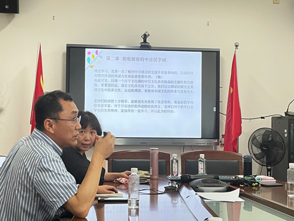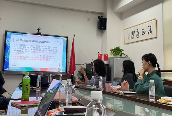 报告中,乔老师以日语系三年级学生在日译汉课上使用的6篇《天声人语》(选自《朝日新闻》)为素材,收集了38名学生的的180篇汉语译文,从“视点+着眼点”“主题的势力”等维度对译文中因主题省略导致的翻译偏误进行了详致的分析和考察,探明了学习者产生误译的主要原因,提出了两个教学对策。一个是,对于“主题统治力认识偏差”问题,提出可以导入“C位定律”的对策;另一个是,对于“主题视点”问题,提出可以运用“第一人称代入法”加以验证的对策。乔颖老师的报告,结合学生的翻译实例,深入浅出,内容详实。老师们就日语与中文文章的写作特点、中日标点符号的差异、《雪国》英译本及中译本的准确性问题、口译课堂的主语省略问题的教学实践等进行了广泛而深入的交流。