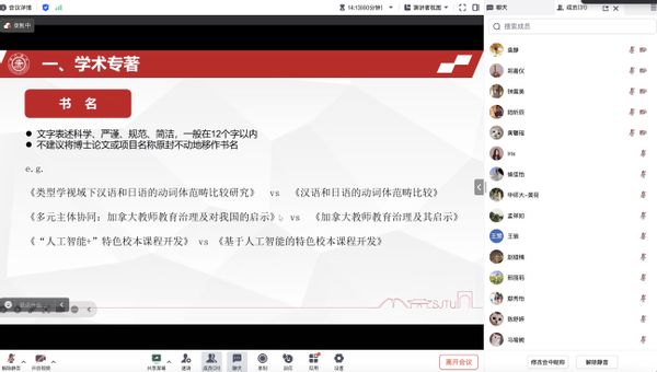 张冠男老师从“学术著作出版、教材出版、知识服务和项目申报”四个方面为全体党员提供了宝贵的学术经验和职业指导。在学术著作出版方面,张老师从上海交通大学出版社的实际经验出发,指出了选题、书名、体例等一些规范性问题的注意要点,并分享了国内外出版流程的细节和编辑工作的严谨性。在教材出版方面,张老师逐一介绍了各种教材形式以及教材编写的注意事项,并向大家呈现了新时代数字教材的特点和优势。在知识服务方面,张老师通过课程出版、平台建设和学术培训的具体案例,强调了在“新文科”背景下外语专业转型的重要性和可行性。在项目申报方面,张老师首先细致为大家讲解了“中华学术外译项目”和“国家社科后期资助项目”,接着根据以往的立项的成功案例总结了相关细节经验,并分析了两个基金的共同特点和资助学科分布。