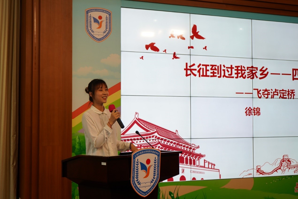 外国语言学及应用语言学专业的徐锦同学自去年十月接到宣讲任务后,深入学习了四川省红军长征历史,把所学所思所悟融入课程《红军飞夺泸定桥》当中。她说:“泸定桥战役中,红军战士们将自己的安危置之度外,勇往直前,直至夺取最后的胜利。这种精神力量让他们在生命的考验面前始终坚守着自己的初心。” 她用“I’m the best! I’m the greatest! I’m invincible.”三句话,激励同学们在遇到生活中、学业上的困难时,不要轻言放弃。