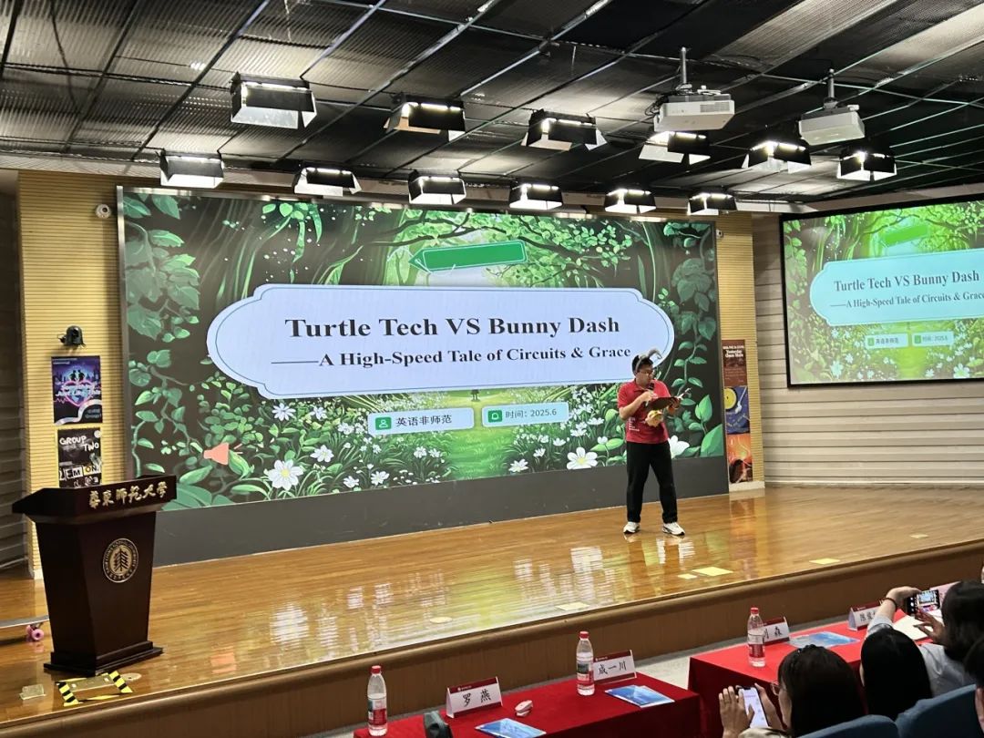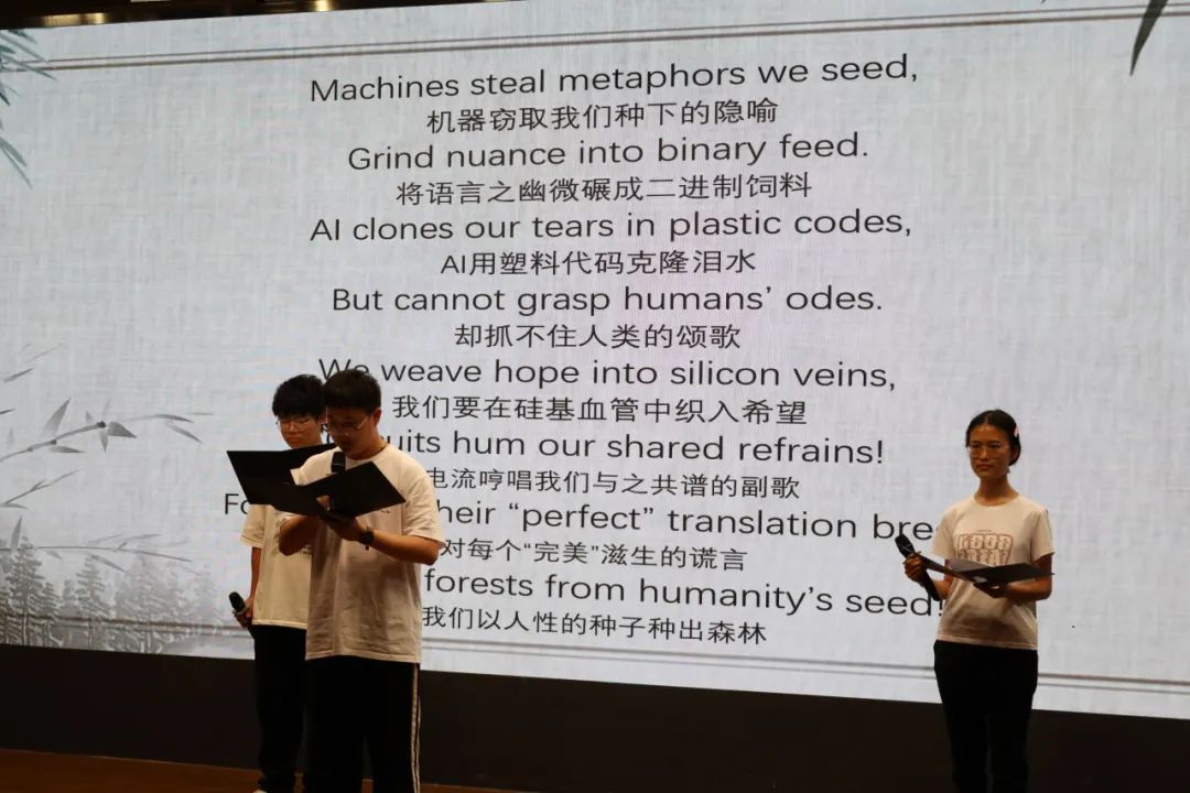 值得一提的是,原创诗歌朗诵成为贯穿赛事的精神主线。六组作品紧扣"VOICE:Vibrate, Open, Inspire, Communicate, Empower"主题,形成层层递进的思考。G2组发出"No wall can mute this sonic ocean"的宣言,G3组揭示了声音作为生命共振(Vibrate)的本质,G4组的诗歌沟通的核心价值,G5组则发挥创意,演绎了一出高科技版龟兔赛跑,点明协作对个体潜能激发)的意义,G6组展现了译者直面AI挑战的魄力和态度。