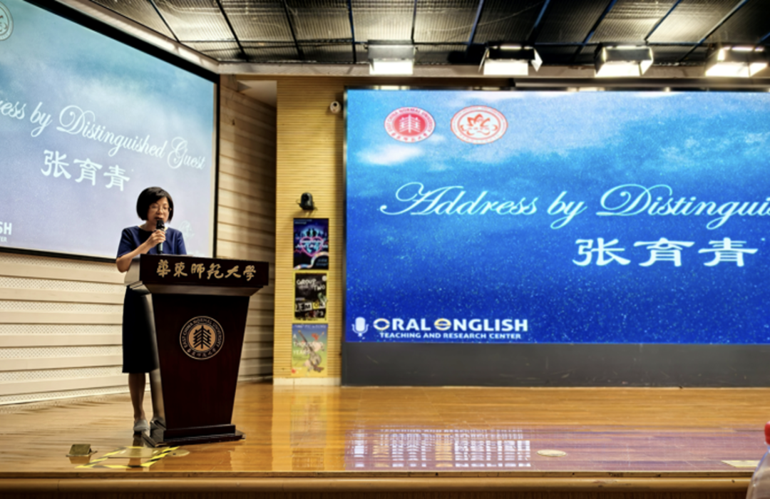 2007年首届语音助教团队第一负责人、现任上海对外经贸大学会展与传播学院党委副书记邱子桐老师上台发言。她简要回顾了当年参与语音语调大赛的经历,表达了对那段青春时光的怀念,并对比赛延续至今、不断发展表示欣慰与祝贺,同时鼓励同学们珍惜平台,不断追求卓越。