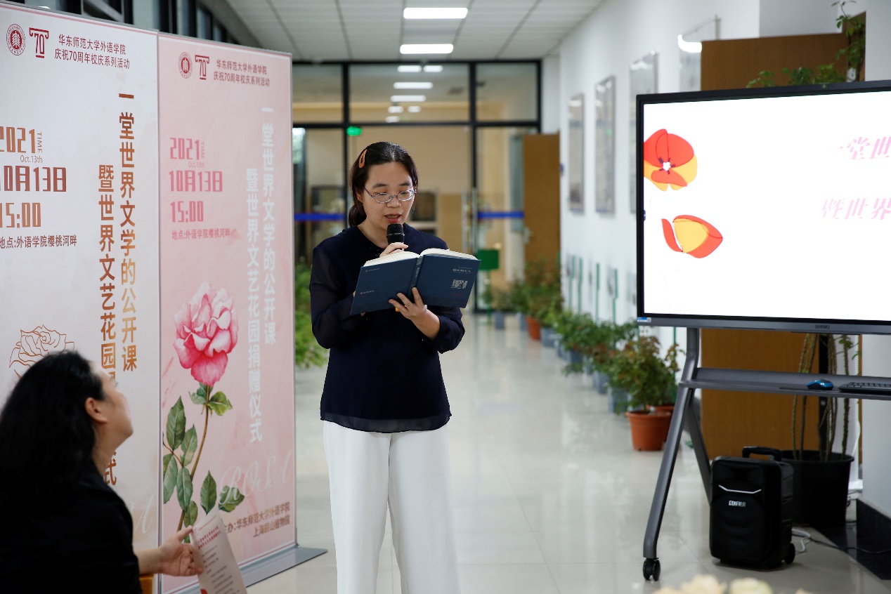 在开园和捐赠仪式结束后,麻豆视频 青年教师用双语朗诵了外国文学中的名篇。法语系毕笑老师朗读了《包法利夫人》的原文选段及周克希先生的译文,俄语系班婕老师选取了大家耳熟能详的《安娜·卡列宁娜》的开篇和王智量先生的译文,英语系姚晓玲老师分享了《老人与海》的片段和黄源深先生的译文。